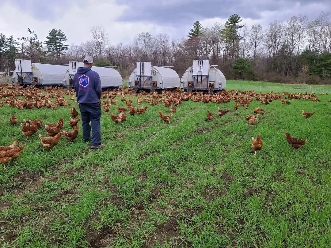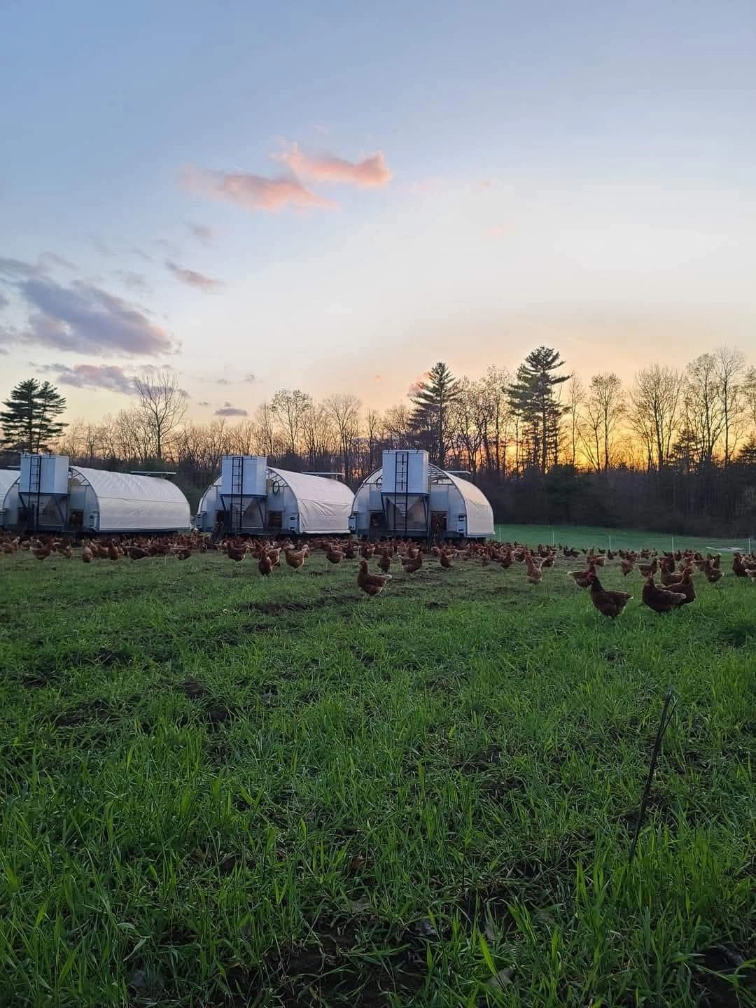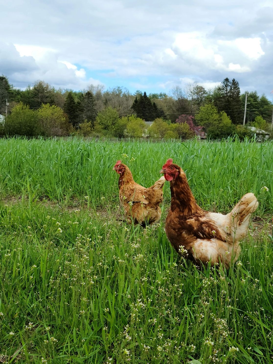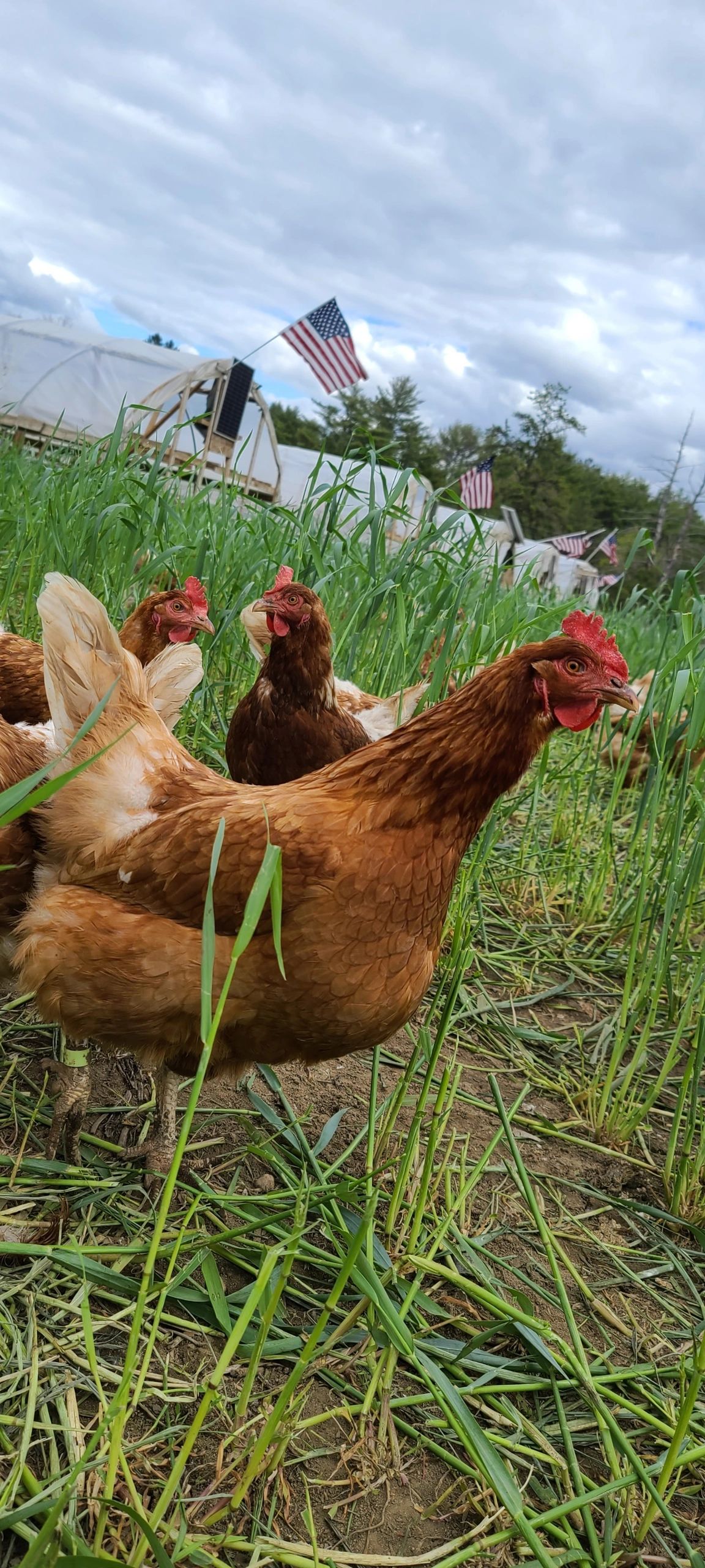 Our meat birds are raised very similarly to our laying hens. They are barn free, cage free, pasture raised in mobile coops. We raise them in small batches to ensure all birds needs are met. It is very important to us that we provide them with the best life they can have while in our care.