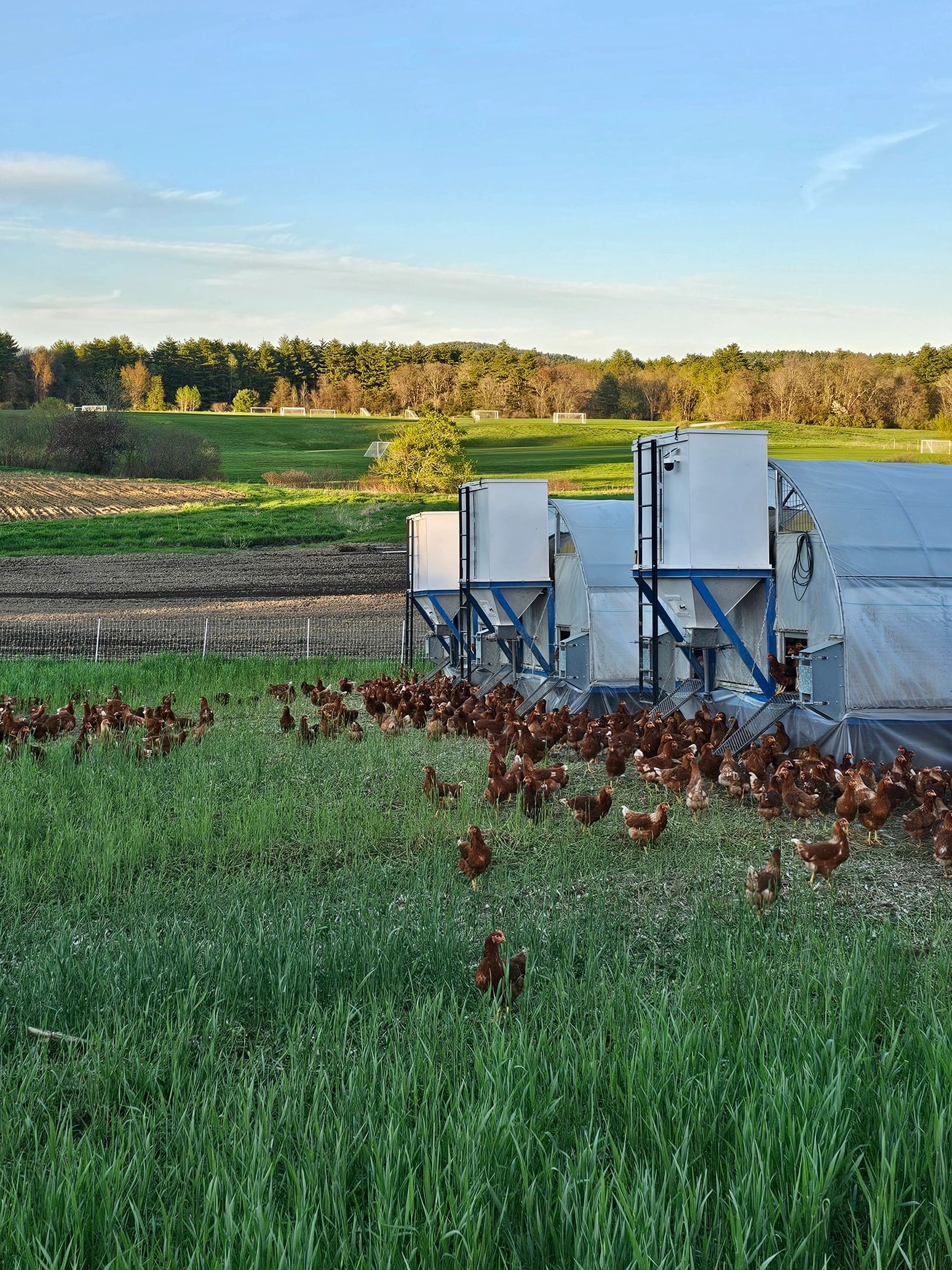 Our hens live on our 60 acres of farm fields, at various locations throughout the season. While we do have coops for night time protection and laying boxes, our hens are outside, foraging and roaming our fields everyday.